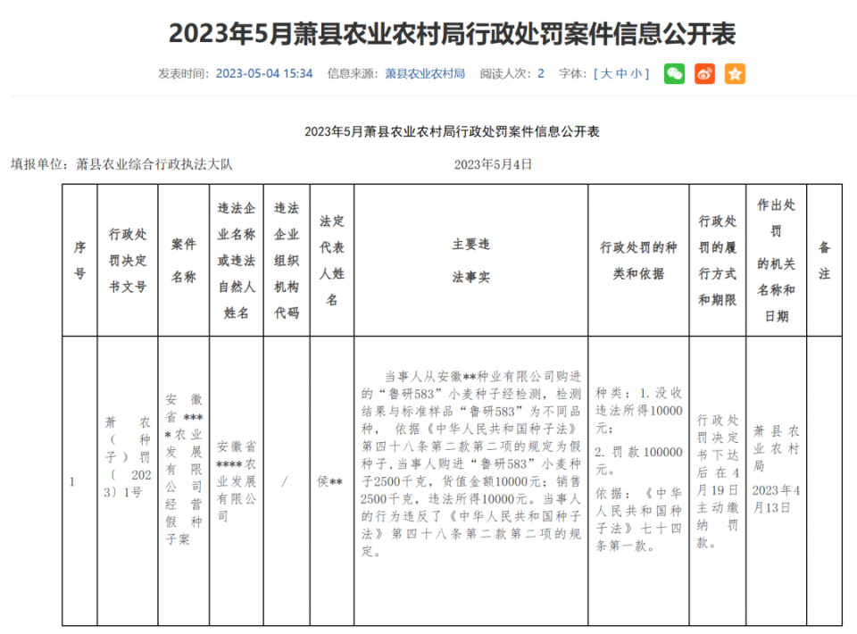 安徽宿州公布一起假“鲁研583”小麦种子案件,罚款10万元