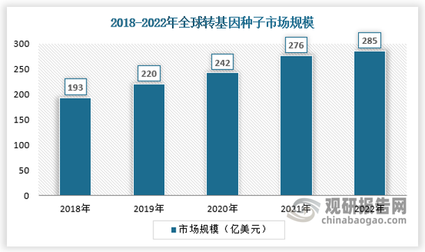 从全球来看,随着转基因播种面积的增加,全球转基因种子的市场规模也在持续增加。2022年,全球转基因种子市场规模约为285亿美元。