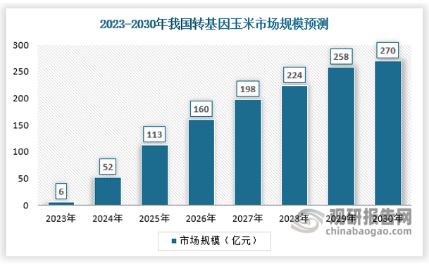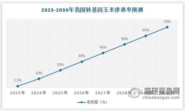 2023年,中国转基因玉米由大田试验转为部分区域试销,参考美国转基因玉米推广经验,2023年中国转基因玉米渗透率约为1.5%,预计未来2024-2026年,渗透率分别为10%、20%、30%。预计到2030年,转基因玉米种子渗透率达到70%,市场规模达到270亿元。