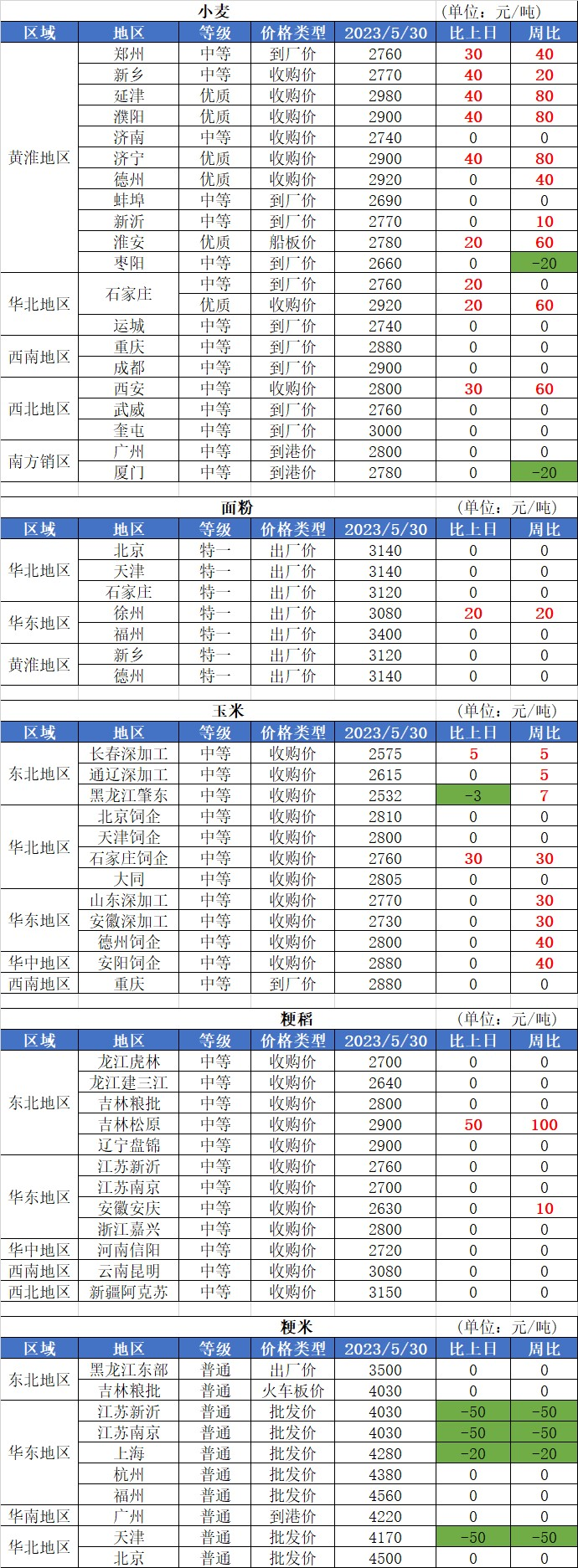 2、5月30日国内玉米价格小幅波动,其中:南方销区玉米价格基本稳定,南北港口玉米价格小幅上涨,涨幅20-30元/吨,华北地区、山东地区玉米价格局部小幅下跌,跌幅10-44元/吨,东北地区玉米价格基本稳定,局部小幅波动,变幅10元/吨。