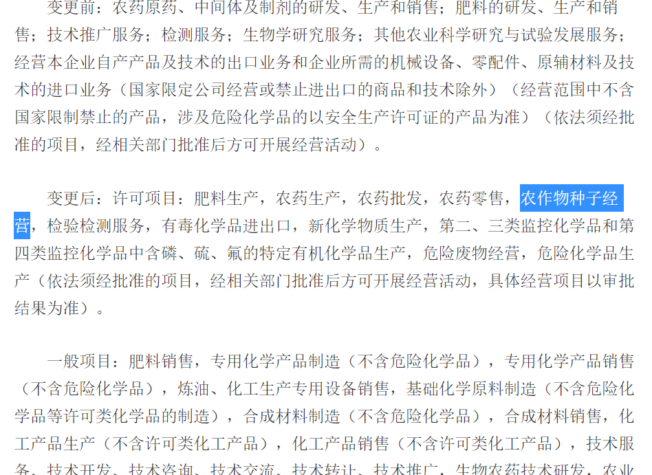 6月10日,山东先达农化股份有限公司发布关于全资子公司经营范围变更的公告,公告中,全资子公司辽宁先达农业科学有限公司完成经营范围变更登记,变更后的许可项目新增了“农作物种子经营”。