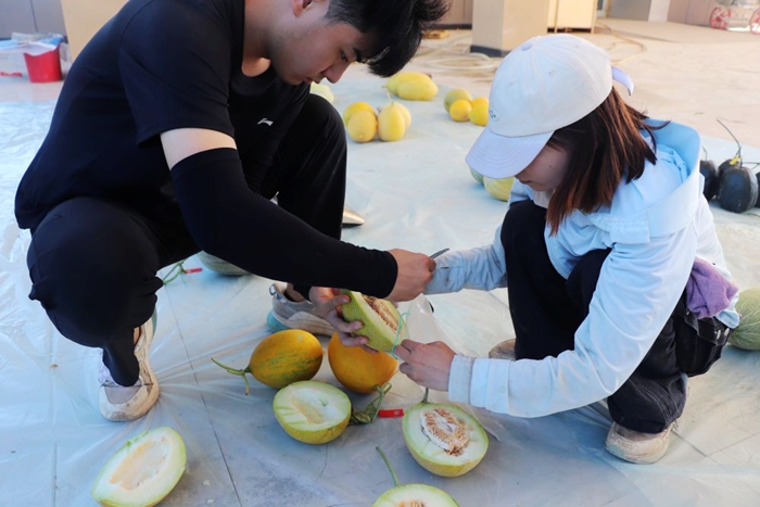 7月14日,工作人员在进行甜瓜果肉糖度数据采集。新华社记者 尚升 摄