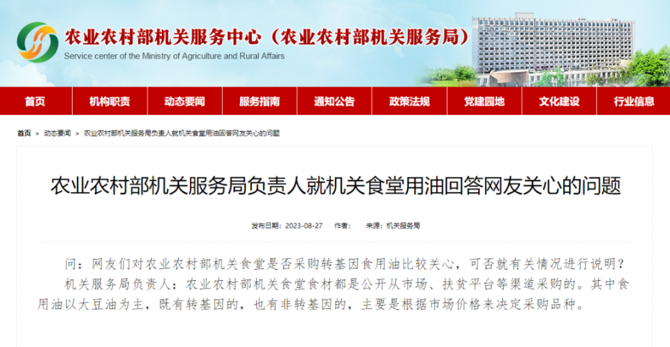 :农业农村部机关食堂食材都是公开从市场、扶贫平台等渠道采购的。其中食用油以