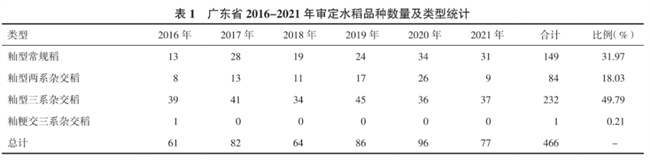 从表1可知,广东省2016-2021年审定通过的水稻品种共466个,其中2016年61个、2017年82个、2018年64个、2019年86个、2020年96个、2021年77个,年平均审定78个品种;广东省审定通过的水稻品种类型主要是籼型常规稻、籼型两系杂交稻和籼型三系杂交稻,其品种数量分别为149个、84个、232个,分别占总数的31.97%、18.03%和49.79%,均适宜在广东省内早晚造种植。有21个香稻通过审定,包含籼型常规稻11个和籼型三系杂交稻10个;有18个有色稻通过审定,其中红米17个(包含9个籼型常规稻、6个籼型两系杂交稻、2个籼型三系杂交稻)、黑米1个(南两优黑一号)。