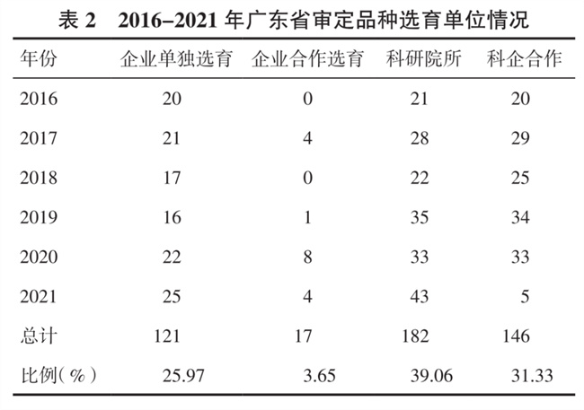 广东省2016-2021年通过审定的466个水稻品种主要由科研院所、企业以及科企合作选育,企业合作选育的品种数量较少,其中由科研院所选育的品种数量为182个,占39.06%;由企业单独选育的品种数量为121个,占25.97%;由科研院所和企业合作选育的品种数量为146个,占31.33%;由企业间合作选育的品种数量为17个,仅占3.65%(表2)。