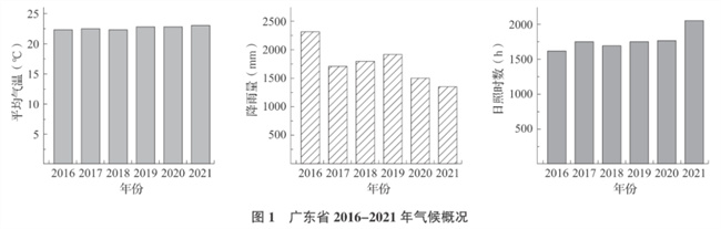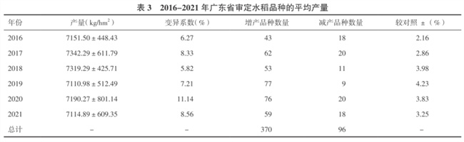 广东省2016-2021年的年平均气温稳定在22.3~23.0℃之间,日照时数除2021年外,其他年份的日照时数比较接近,整体气候条件比较稳定(图1)。2016-2021年广东省审定水稻品种的各年份每hm²平均产量分别为7151.50kg、7342.29kg、7319.29kg、7110.98kg、7190.27kg、7114.89kg,同年相比区域试验对照品种,增产幅度分别为2.16%、2.86%、3.98%、4.23%、3.83%、3.25%,共有370个水稻品种比对照增产,占审定品种总数的79.40%,96个水稻品种相对对照减产,占审定品种总数的20.60%。除2020年审定品种产量变异系数为11.14%外,其他年份审定的水稻品种产量变异系数均小于10%,各年份审定的水稻品种产量相对平稳,气候条件对审定品种的产量影响较小(表3)。
