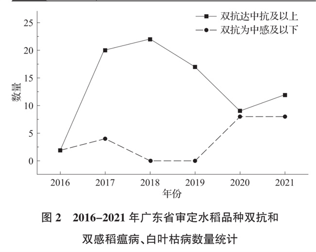 由表5可知,2016-2021年广东省审定通过的水稻品种稻瘟病抗性为高抗、抗、中抗、中感、感和高感的水稻品种数量分别为87个、299个、54个、17个、7个和2个,稻瘟病抗性中抗及以上的水稻品种数量为440个,占94.42%,表明广东省2016-2021年所审定通过的水稻品种具备较强的稻瘟病抗性。2016-2021年广东省通过审定的水稻品种白叶枯病抗性为抗、中抗、中感、感和高感的水稻品种数量分别为20个、66个、133个、170个和77个,白叶枯病抗性中抗及以上的水稻品种数量为86个,占18.45%,说明广东省2016-2021年所审定通过的水稻品种的白叶枯病抗性仍有提升的空间;同时具备双抗(稻瘟病、白叶枯病抗性)达中抗及以上水平的水稻品种数量为82个(图2)。