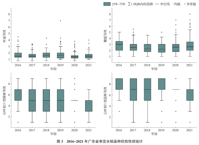广东省2016-2021年各年审定通过的水稻品种叶瘟和穗瘟等级较低且波动幅度较小(图3),其审定品种的叶瘟等级范围在0.8~3.0之间,50%的品种叶瘟等级在1.2~2.0之间,叶瘟平均等级、中位数等级分别在1.45~1.76、1.4~1.6之间;审定品种的穗瘟等级范围在1.0~5.4之间,50%的品种数量穗瘟等级在1.7~3.5之间,穗瘟平均等级、中位数等级分别在2.27~2.81、2.2~3.0之间。白叶枯菌株的抗性有一定的波动,2016年审定水稻品种的白叶枯菌株抗性弱于其他年份,2016年Ⅳ型菌株抗性的平均等级、中位数等级分别为6.79、7.0,Ⅴ型菌株抗性的平均等级、中位数等级分别为8.07、7.0,而2017-2021年份的Ⅳ型菌株抗性平均等级、中位数等级分别为4.42~5.21、5.0,Ⅴ型菌株抗性平均等级、中位数等级分别为6.30~7.07、7.0(图3)。