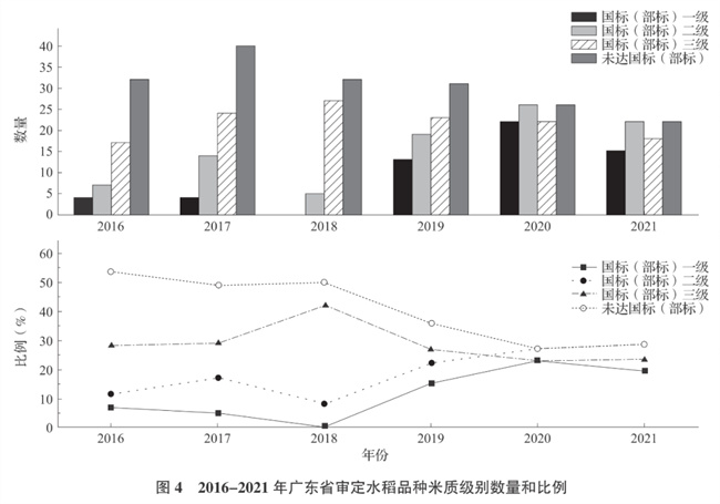 广东省2016-2021年审定的水稻品种中有282个水稻品种米质达到国标优质三级(部标三级)及以上,其中籼型常规稻118个、籼型三系杂交稻113个、籼型两系杂交稻51个,共占审定品种总数的60.52%(表6)。广东省审定通过的水稻品种达到国标一级(部标一级)和国标二级(部标二级)的优质水稻品种比例整体增加,未达国标(部标)米质优质的品种数量比例由2016-2018年的48.78%~54.10%逐渐下降至2020年的27.08%和2021年的28.57%,达到国标(部标)优质的水稻品种数量占比整体增加(图4)。2016-2021年广东省审定的水稻品种的垩白度逐年下降,稻米透明度级别逐年降低,稻米的长宽比在2020-2021年有增加的趋势,所审定品种的整体米质性状有一定的提升(表7)。