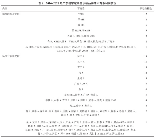 由表8可知,2016-2021年广东省审定通过的317个杂交稻品种共使用了129个不育系,其中两系不育系38个、三系不育系91个。所审定的317个杂交稻中,有180个杂交稻利用了本省选育的52个不育系,137个杂交稻利用了外省选育的77个不育系,表明广东省审定杂交稻利用的不育系来源较广,对外省的不育系依赖程度不高;总共有71个不育系仅有1个品种通过审定,27个不育系有2个品种通过品种审定,分别占不育系总数的55.04%和20.93%。恒丰A所配组合中通过审定的水稻品种最多(共18个),其次是五丰A(15个)、吉丰A(13个)、Y58S和裕A(12个)、深08S和金龙A(8个)、广泰A和卓A(7个)、南11S和胜A(6个),表明这些不育系具备较高的配合力。(参考文献略)