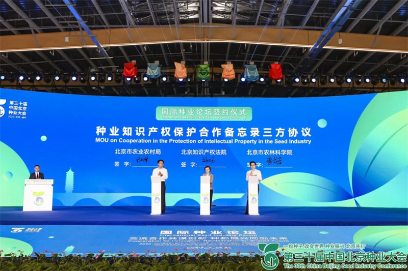 主论坛上,北京市农业农村局、北京知识产权法院、北京市农林科学院签署种业知识产权保护合作备忘录三方协议。