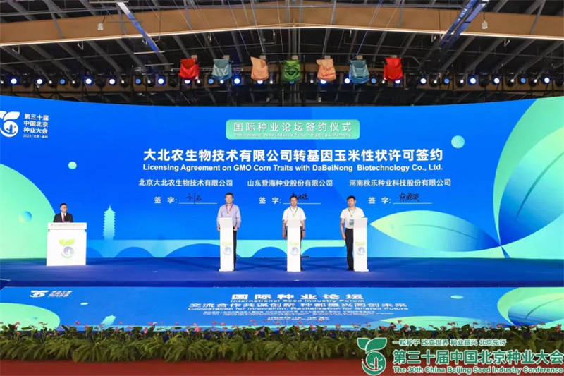 主论坛上进行大北农生物技术有限公司转基因玉米性状许可签约(北京大北农生物技术有限公司、山东登海种业股份有限公司、河南秋乐种业科技股份有限公司)