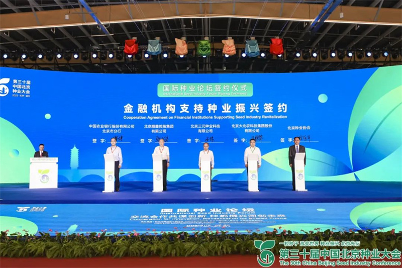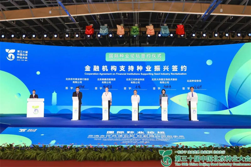 主论坛上进行金融机构支持种业振兴签约(北京农村商业银行股份有限公司、北京顺鑫控股集团有限公司、北京三元种业科技有限公司、北京大伟嘉生物技术股份有限公司、北京种业协会)