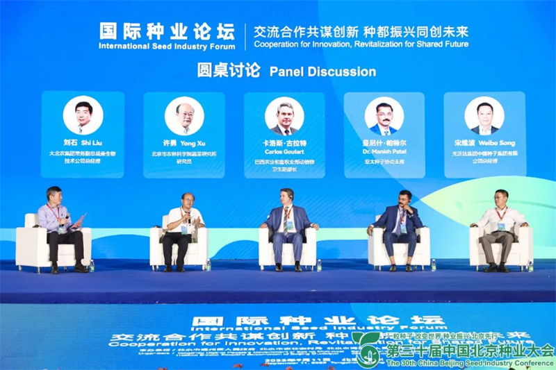 积极参与国际合作是中国种业可持续发展的有效路径。论坛最后举行了圆桌对话,巴西农业和畜牧业部动植物卫生副部长卡洛斯·古拉特、亚太种子协会主席曼尼什·帕特尔、北京市农林科学院蔬菜研究所研究员许勇、先正达集团中国种子集团有限公司总经理宋维波就生物育种创新发展和国际合作话题展开交流。对话由大北农集团常务副总裁兼生物技术公司总经理刘石主持。