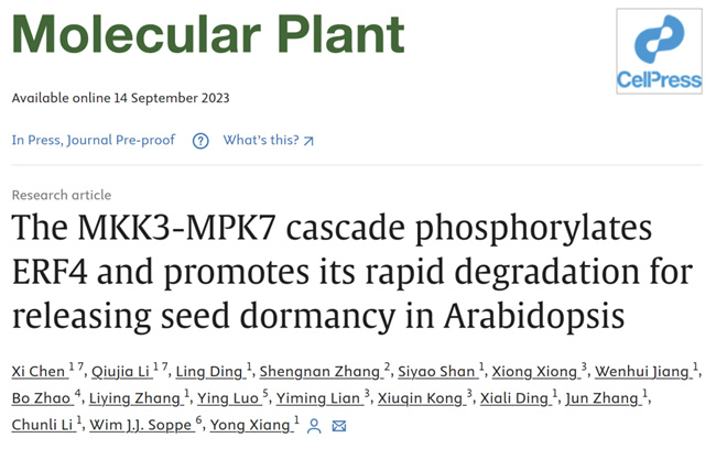 2023年9月13日,中国农业科学院深圳农业基因组研究所向勇课题组在Molecular Plant在线发表了题为“The MKK3-MPK7 cascade phosphorylates ERF4 and promotes its rapid degradation for releasing seed dormancy in Arabidopsis ”的研究论文。文章揭示了种子释放休眠启动萌发的新机制。