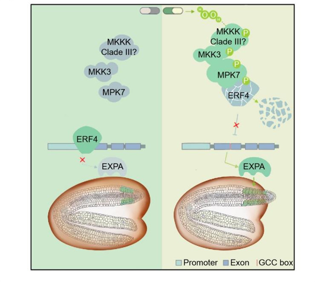 该研究鉴定到由MKK3-MPK7激酶级联和乙烯应答因子ERF4组成的命运开关,负责调控种子从休眠状态到萌发状态的转变。研究发现,休眠解除因子,如赤霉素,低温层积,以及双氧水处理等能够激活MKK3-MPK7模块,后者通过激活细胞扩增相关基因EXPAs的表达来释放种子的休眠。进一步的研究鉴定到MKK3-MPK7模块的的一个直接底物,ERF4。ERF4是本研究新发现的休眠调控基因,它能够直接结合在位于EXPAs基因外显子的GCC box上,抑制EXPAs基因的表达,从而抑制种子萌发。当种子感知到环境中的萌发信号后,被激活的MKK3-MPK7模块能够磷酸化ERF4,导致ERF4的快速降解,从而释放ERF4对EXPAs基因表达的抑制作用,使种子能够萌发。该项研究工作揭示了一条由蛋白质磷酸化、蛋白质降解和基因表达调控组成的信号传递链,通过这条信号链,种子胚胎内的萌发促进因子能够感知并响应环境中的萌发信号。由于MKK3和MPK7是种子休眠的负调控因子,因此可以在水稻和小麦等农作物进行基因编辑,改良作物种子的休眠特性,减少极端天气下穗发芽的发生,保障粮食生产和食品安全。