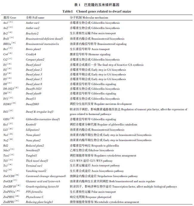 1935 年,Emerson 发现了第一个玉米矮秆基因 Brachytic2(Br2),Br2 的发现为玉米矮秆、半矮秆育种奠定了基础。br2 突变体茎秆细胞长度较野生型相比减少40%-50%,使得其节间缩短,尤其是果穗以下节间缩短更为显著,株高降低约50%。与茎秆长度相反,茎秆的周长明显增加,br2 突变体的茎秆表皮下方较野生型相比多形成了10 余层薄壁细胞,极大增强了br2 的茎秆强度。从农艺学角度,br2 的表型是极具高产潜力的:其上疏下密的株型有助于通风透光,发达的根系使植株对水肥有着极强的耐性,而它最关键的优势则是对茎秆强度的协同效应,是公认的颇具商业价值的株高改良基因。目前已知的矮秆基因有60 余个,其中大部分已被克隆(表1)。
