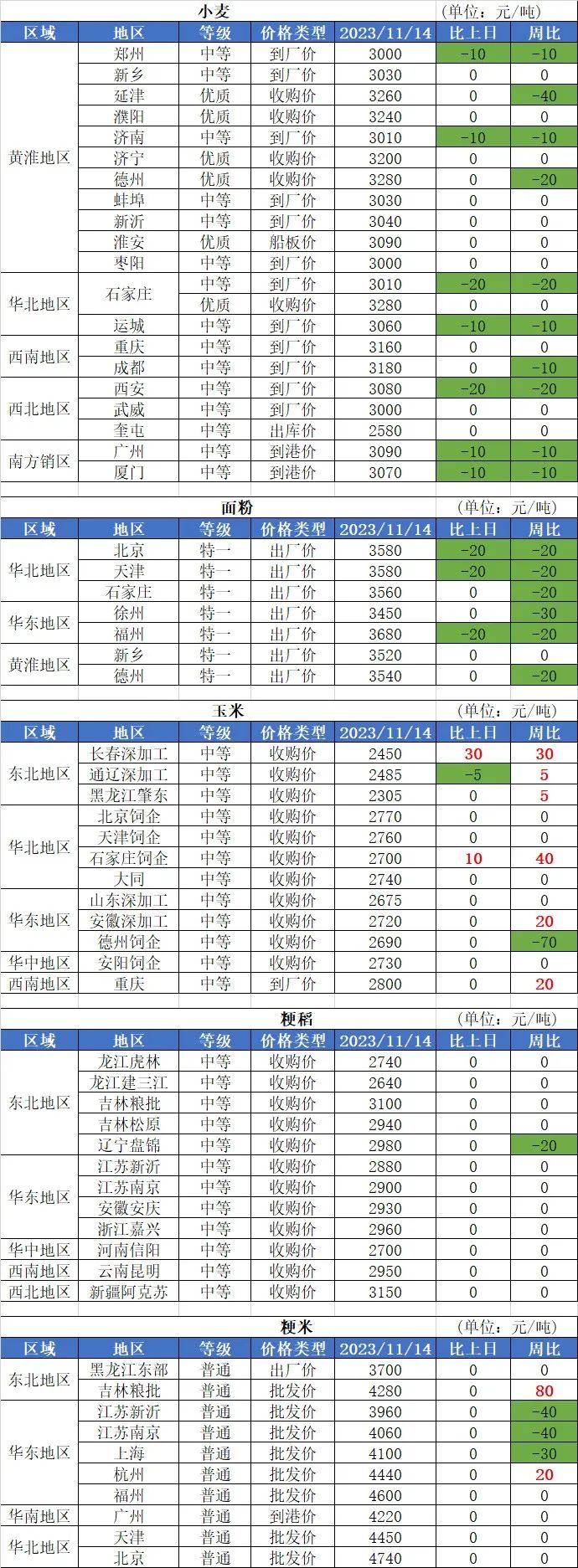 2、11月14日国内玉米价格稳中有涨,其中:南北港口、南方销区玉米价基本稳定;华北地区、东北地区玉米价格基本稳定,局部价格小涨,涨幅10-20元/吨。