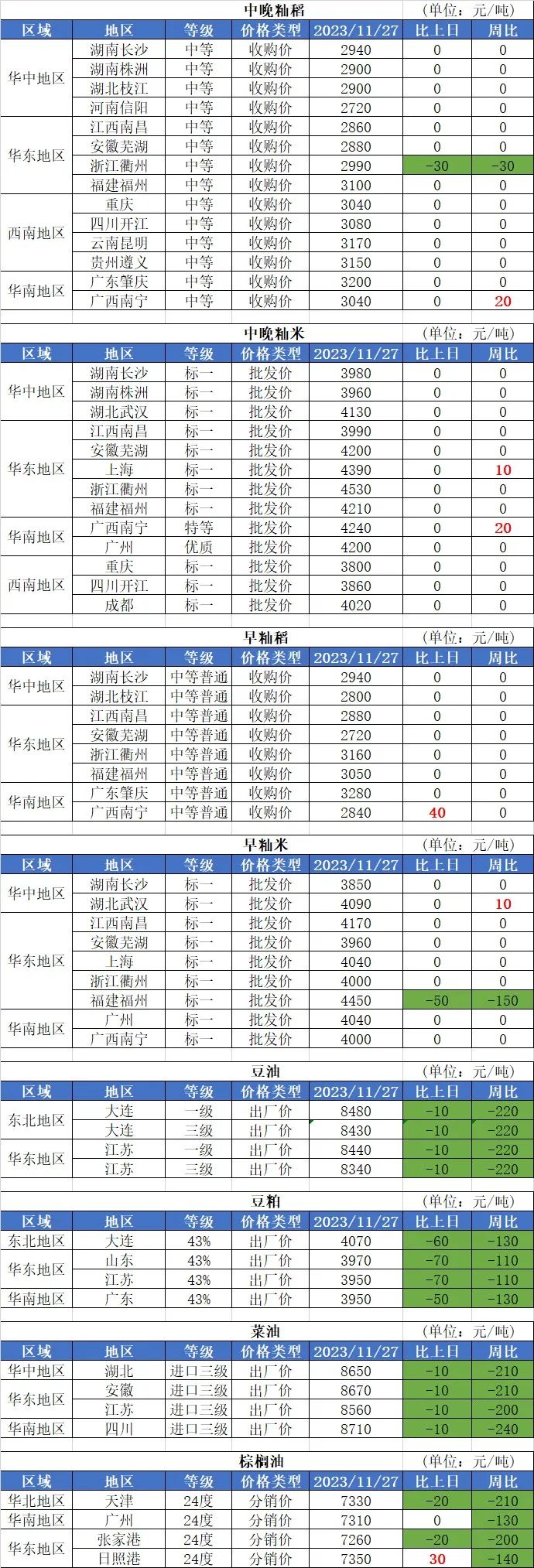 5、近期国内油脂价格震荡下行,市场购销谨慎,进入12月国内进口大豆以及菜籽量较多,特别是11月份有部分大豆延迟到港,棕榈油高库存的格局持续,三大油脂库存充足,价格走势仍取决于南美天气。