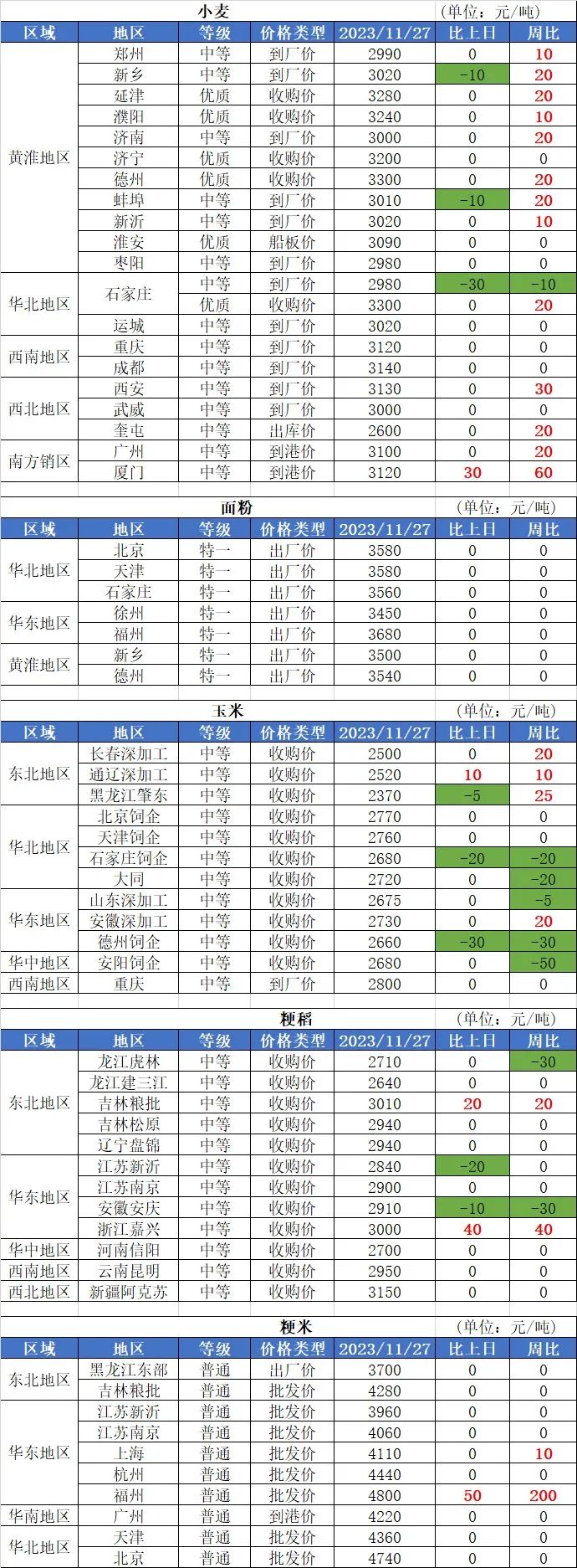 2、11月27日国内玉米价格局部下跌,其中:南北港口、东北地区、南方销区玉米价基本稳定;华北地区玉米价格基本稳定,局部价格小幅下跌,跌幅20-40元/吨。