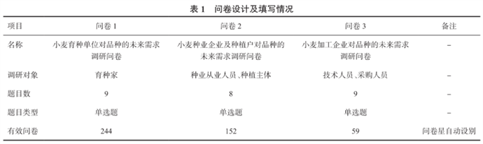 本文以小麦加工企业对小麦的需求为基础,根据小麦产业链的育种主体、种业企业/种植主体和加工企业等分别设计3套电子问卷(表1),使用问卷星(在线问卷调查平台)进行调研,同时进行电话咨询调研。第1套问卷是小麦育种单位对品种的未来需求调研问卷,主要是育种环节育种单位种质资源状况、育成品种、目前和未来育种目标等内容;第2套问卷是小麦种业企业及种植户对品种的未来需求调研问卷,种业企业及种植户对小麦品种特性的追求目标是一致的,设计为一张问卷,内容主要是对品种特性要求、风险考量和未来需求等内容;第3套问卷是小麦加工企业对品种的未来需求调研问卷,主要是小麦加工企业产品类型、小麦原粮品质需求及现状、未来品质关注点等内容。本次调研时间为2022年10-12月,问卷星(在线问卷调查平台)电子问卷通过“国科农研院”微信公众号发放到行业从业人员或专业微信群,问卷星后台自动搜集填写信息,问卷有效性和统计分析由问卷星自动识别和完成。电话咨询以电话形式就行业发展现状、存在问题及可能的对策等行业内容咨询育种家、种业企业、种植大户、加工企业技术人员和采购人员等专业人员,然后进行分析总结。通过问卷统计分析和咨询情况,从产业链视角分析我国小麦产业发展对小麦品种品质的需求,提出针对性对策措施。