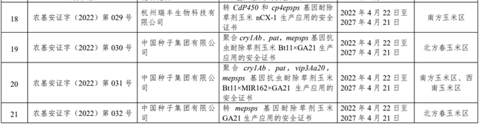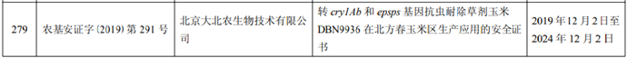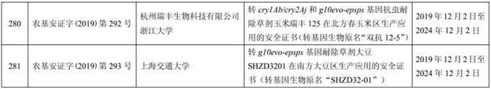 2019年公布的农业转基因生物安全证书(生产应用)批准清单(部分)