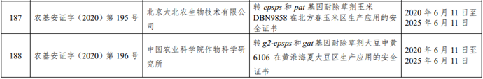 2020 年农业转基因生物安全证书(生产应用)批准清单