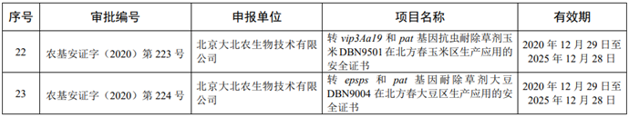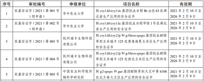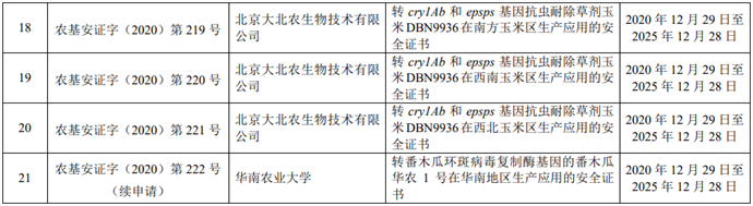 2020年发放的两批清单中,共有1家公司(大北农)、1所大学(华南农业大学)和1所科研机构(中国农业科学院作物科学研究所)获批生产,性状主要包括耐除草剂玉米、耐除草剂大豆,以及转番木瓜环斑病毒复制酶基因的番木瓜。