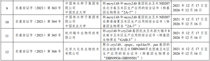 2021年发放的三批清单中,共有2家企业(大北农、杭州瑞丰)、1所大学(华中农业大学)、1所科研机构(中国农业科学院作物科学研究所)和1家企业与科研院所合作(中国林木种子集团有限公司&中国农业大学)获批生产。性状主要包括抗虫水稻、抗虫耐除草剂玉米、耐除草剂大豆和抗虫玉米等四种。