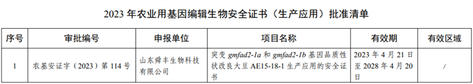 在基因编辑生产应用方面,2023年4月,我国下发首个农业用基因编辑生物安全证书(生产应用),该证书由山东舜丰生物科技有限公司摘得,主要用于大豆的品质性状改良。