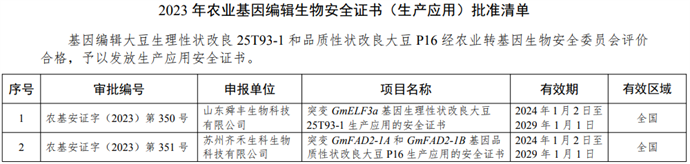 而昨日新发的农业用基因编辑生物安全证书(生产应用)中,除了之前已获得的舜丰生物之外,还新增加了苏州齐禾生科生物技术有限公司。证书批准项目同样也是用于大豆品质性状改良。