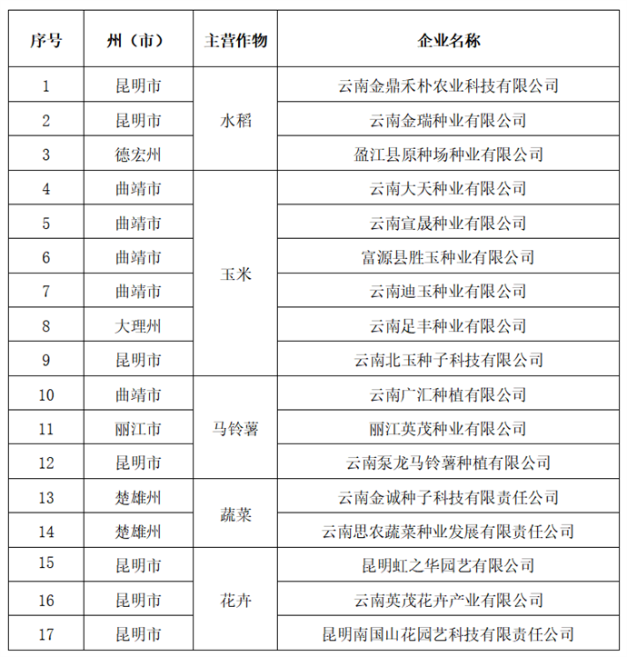 云南省农业农村厅关于省级种业阵型企业拟推荐名单的公示