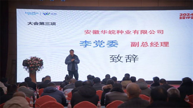 会上,安徽华皖种业有限公司副总经理李党委在致欢迎词向长期支持华皖种业发展的各位合作伙伴表示感谢。他表示,面对行业发展巨大变化,激烈的市场竞争,公司为在座各位VIP客户搭建了交流合作平台,希望各位合作伙伴分享彼此成功经验,凝聚智慧,与公司同频共振,共同探讨种业发展趋势,交流思想,分享新思路,携手同行,共创未来!