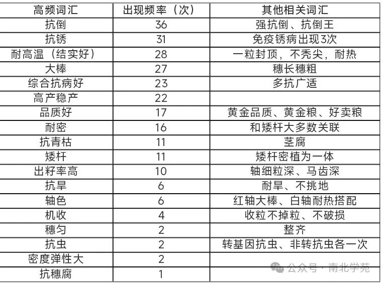 5.词汇“耐密”提及16次,“矮杆”提及11次,说明当下对矮杆密植型品种的热度正在兴起;