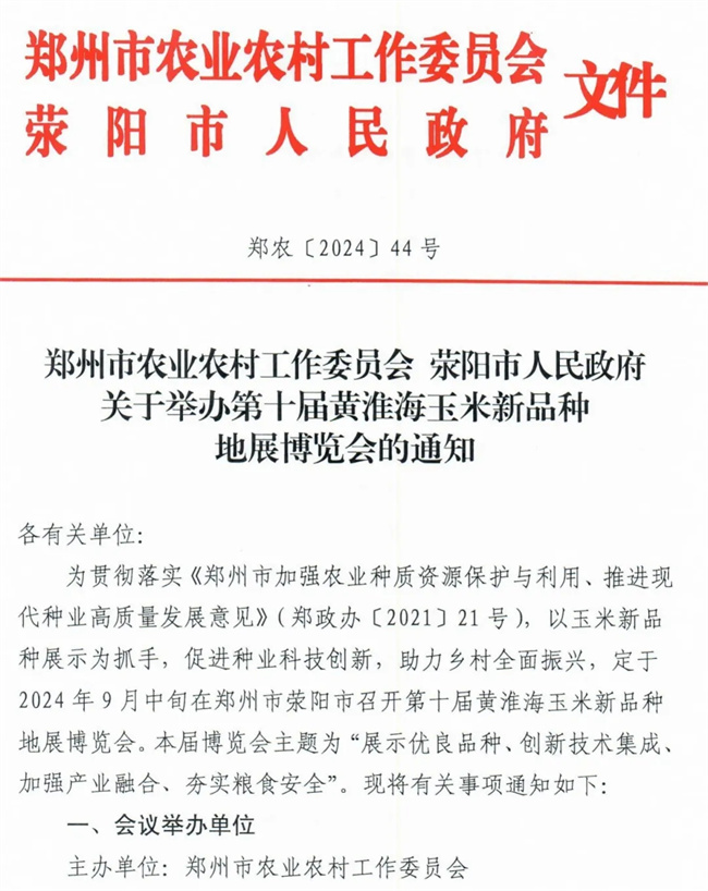 为贯彻落实《郑州市加强农业种质资源保护与利用、推进现代种业高质量发展意见》(郑政办〔2021〕21号),以玉米新品种展示为抓手,促进种业科技创新,助力乡村全面振兴,定于2024年9月中旬在郑州市荥阳市召开第十届黄淮海玉米新品种地展博览会。本届博览会主题为“展示优良品种、创新技术集成、加强产业融合、夯实粮食安全”。现将有关事项通知如下: