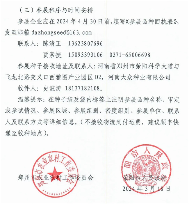 参展企业应在2024年4月30日前,填写《参展品种回执表》,发至邮箱dazhongseed@163.com