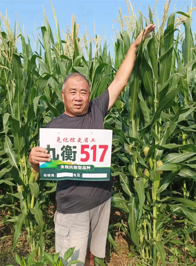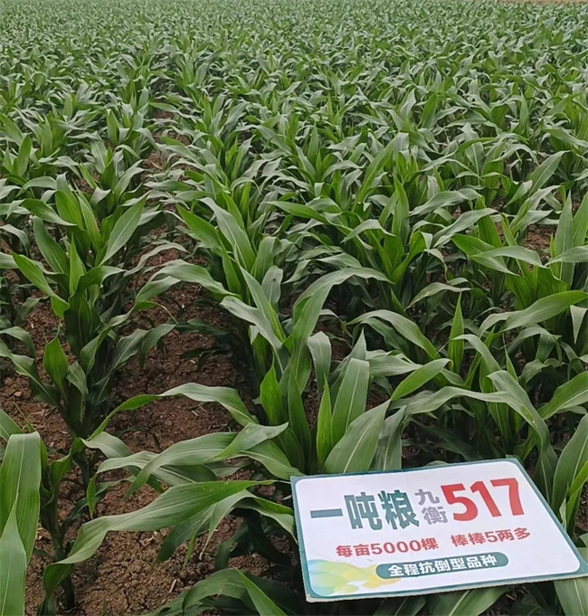 九衡517,2020年通过国家审定,株型半紧凑,株高243厘米,穗位高78厘米,免化控;茎秆粗壮韧性好,根系发达,抗倒能力强;早熟、宜机收、产量高、适应性广等优点,生育期100天左右,较对照品种郑单958早熟3天左右;耐密植,产量高,中高肥力地块4500—5000株/亩;综合抗病性好,接种鉴定:中抗小斑病、穗腐病,感茎腐病、弯孢叶斑病、南方锈病;籽粒脱水快,机械化粒收损失率低。特别在近年来复杂多变气候和病虫害频发、重发的条件下,九衡517抗高温结实、抗青枯和穗腐病等方面的优秀表现,得到种植户的一致好评和经销商的一致认可。