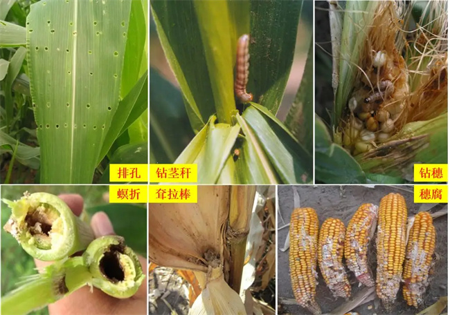 1代玉米螟初期钻驻叶片造成排孔,末期开始钻驻茎秆造成螟折