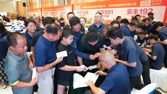 最后,金娃娃种业总经理李玉增就秋乐991上市营销规划做详细分享,就具体营销工作的落实做周密部署,并做秋乐991政策发布。不到十五分钟,2024—2025年度秋乐991种子已被抢订一空。场面异常火爆,会议氛围推向高潮。