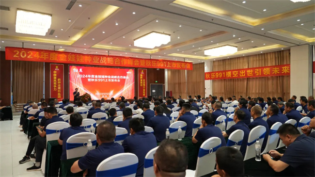 为展示优良玉米新品种,加大推广力度,打造合作共赢新平台,构筑协同发展新机制。8月11日—12日,2024年度金娃娃种业战略合作峰会暨秋乐991上市发布会在中牟大酒店盛大召开。公司领导及来自全国各地的200余位优秀经销商代表齐聚一堂,共同探讨行业面临的挑战与机遇,共谋发展良策,共同推进优良品种高质量发展。