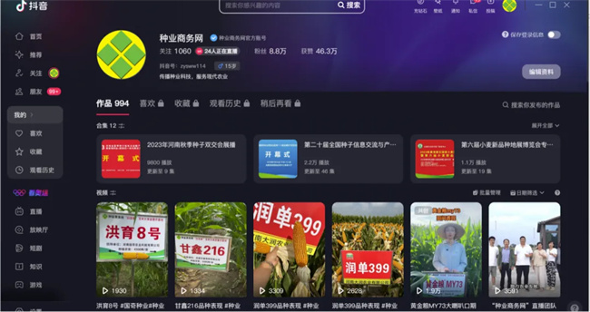 种业商务网-抖音号2020年注册运营, 现有《种业商务网》、《种业商务网-爱农》、《种业商务网-助农》、《种业商务网-护农》、《种业商务网-润农》、《种业商务网-帮农》、《种业商务网-兴农》7个直播间矩阵,目前已累计15万余粉丝,并每天保持700+粉丝增长,种业商务网-抖音号采用主播农技技术讲解+产品全生育期时时直播+产品广告植入+短视频制作发布方式,每日适时更新,每个直播间每天4.5个小时直播时长(7个直播间共计31.5小时),现每天累计观众达30万余人次,是种业商务网农技知识科普,产品宣传的良好窗口。
