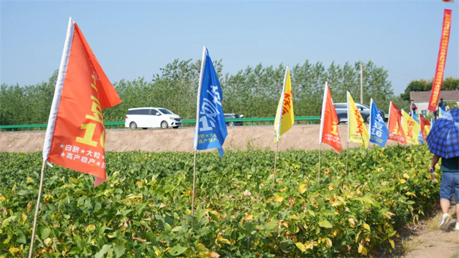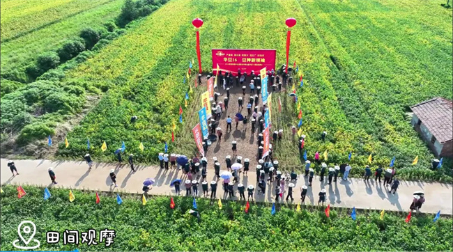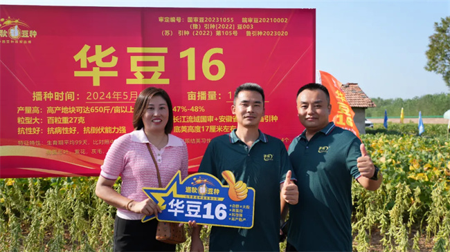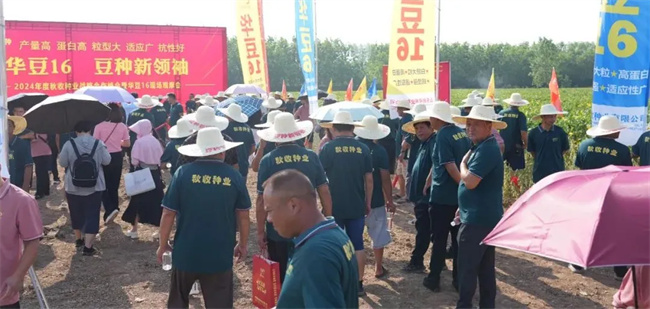会前,参会人员观摩了华豆16大田生产情况,分享了经营推广华豆16舒适的体验,并表达了加大华豆16推广力度坚定信心。据了解,华豆16来源于中黄13/菏豆19父母本的高产稳产抗性好基因,属于高产优质不裂荚大豆品种。2018年、2019年区试较对照达极显著水平,2019年生产试验较对照增产10.09%;抗性好,国家大豆改良中心(南京)抗性鉴定结果,抗大豆花叶病毒流行株系SC3和SC7;品质优,蛋白含量高。抗倒成熟好,成熟时全落叶,不裂荚,抗倒伏。