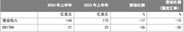 上半年 EBITDA 为 21 亿美元,同比下降 36%(按固定汇率计算下降 30%)。2024 年上半年,集团 EBITDA 利润率为 14.1%,与 2023 年上半年的 18.3% 相比,下降了 4.2 个百分点。2024 年第二季度营业收入为 72 亿美元,比去年同期减少 11 亿美元,同比下降 14%(按固定汇率计算下降 11%)。