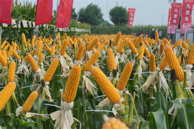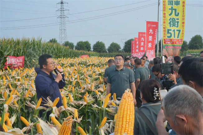 展示田内,据公司技术人员介绍和分享得知:九圣禾6116系出名门,基因好,抗病抗逆又抗倒,轴细粒深,品质优;九衡517,个子矮,穗位低,强抗倒,耐密植,脱水快,宜机收;福抗658,叶子青,秆子硬,产量高;九圣禾6112,抗锈抗青枯,活秆成熟,穗大穗匀,品质优;九圣禾5816,坚秆抗倒,稳产广适,耐高温结实好……