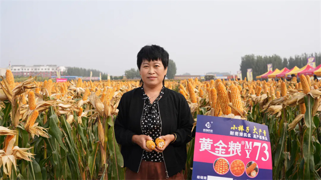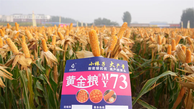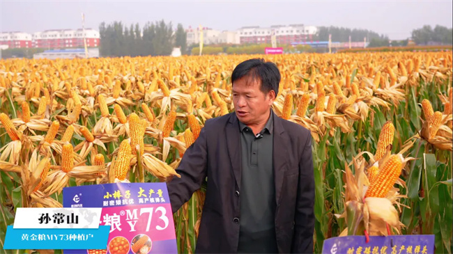 种植大户孙常山在接受采访说:“黄金粮MY73有密度,耐密性非常好、抗高温干旱能力强,结实好,抗倒伏,小棒子,大产量。在本村农户基本上都种的黄金粮,产量在1800斤左右,这个产量大家都感到非常满意。”MY73经销商闫乐义在接受采访时说:“黄金粮MY73具有密度大、品质好、出籽率高,高产优势明显。”