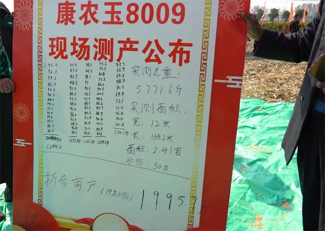 由经销商代表及种植大户组成的测产组,按照玉米田间实收测产要求,通过详细记录、测量籽粒水分、称重、折算等流程,在参会人员的共同见证下,经测定,康农玉8009平均亩产为1995.7斤!在今年这样的极端天气条件下,能有这样优秀的表现,充分体现了品种具有优良的丰产性!收获的籽粒金黄透亮,没有穗腐,获得了参会人员的一致好评。