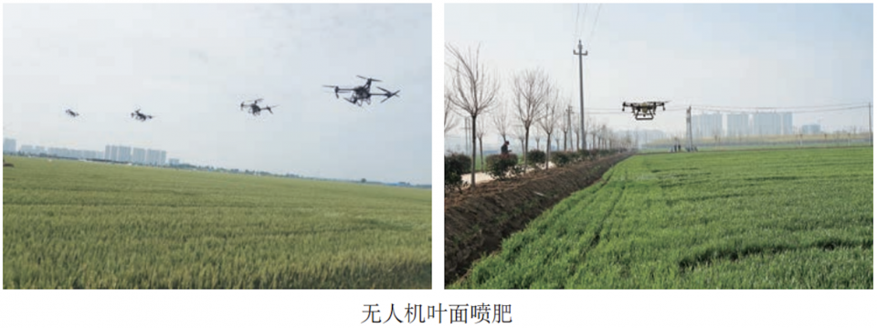 有条件的地区,可在孕穗中期、后期,因地制宜采用无人机叶面适量喷施磷酸二氢钾及硫、锌、硼、锰等中微量元素,增强冬小麦抗逆性,提高抵御干热风的能力,促进养分平衡,防止早衰,增加粒重,提高品质。喷肥时要控制好肥液浓度,磷酸二氢钾为0.2%~0.5%,每次间隔7~10天,共喷施2~3次。