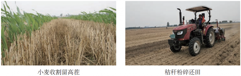 冬小麦收获时,采用联合收割机一次性完成小麦收获和秸秆粉碎还田。小麦割茬高度一般15厘米左右,高留茬应不低于25厘米,秸秆切断及粉碎率在90%以上,并均匀抛撒于地表。秸秆粉碎还田可实现培肥地力和覆盖保墒。