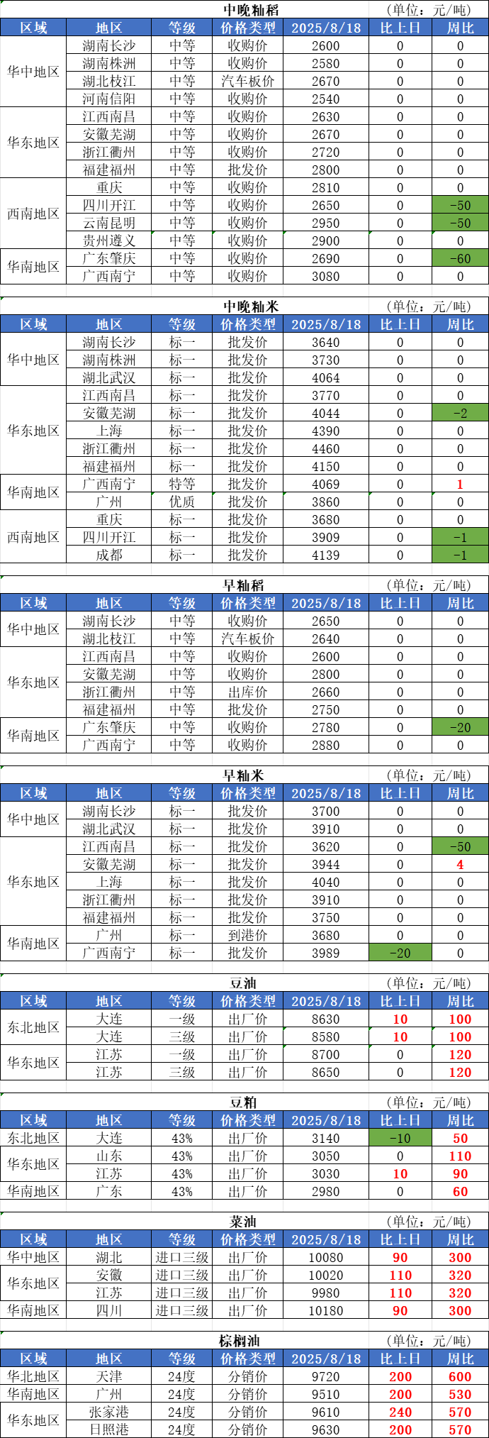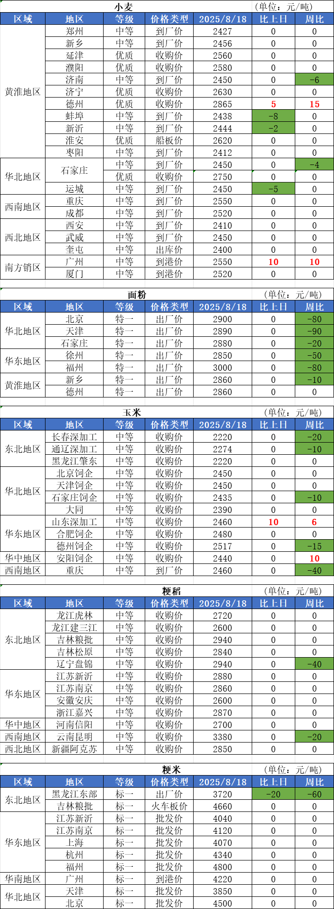 1、8月18日,小麦市场价格延续弱势震荡,零星企业调整收购价格。目前粉企对小麦需求偏弱,小麦供应充足,托市实际收购量对市场影响有限,更多体现在情绪引导,市场估计托市小麦收购量约800万吨左右。