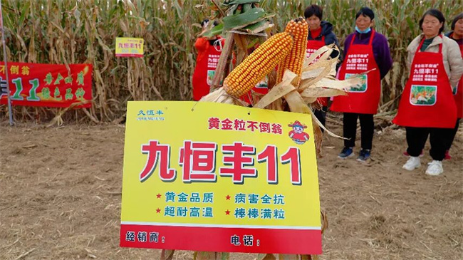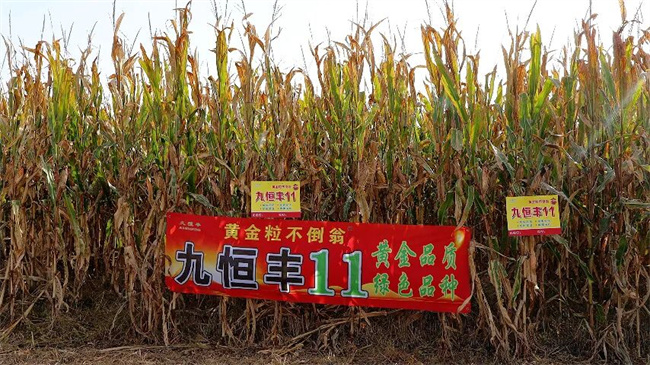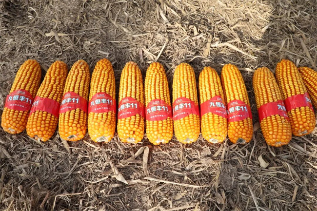 适应多变环境,降低生产不确定性。面对旱涝交替、高温干扰等复杂天气,九恒丰11的站秆、根系、抗病等性状为田间管理提供了相对稳定的基础。对滩区、深耕区、大户连片种植来说,这种“稳健性”能减少生产波动;灌浆周期相对完整,有利于籽粒饱满和商品性。活秆成熟使籽粒灌浆更加充分,籽粒亮黄,果穗均匀。这对于粮食入库、加工企业认可度及销售便利性都有现实意义;种植规模扩展性强,管理压力相对可控。九恒丰11在粗放管理条件下仍保持完整的群体结构,使其适用于:大户规模种植,适应生产条件多变的区域,及年际天气差异大的地带,种植者愿意扩大面积,是其可推广性的重要依据。